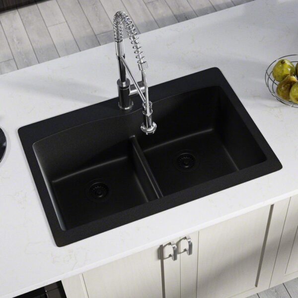 Black Quartz Granite 33 in. Double Bowl Drop-In Kitchen Sink with Matching Strainer and Flange