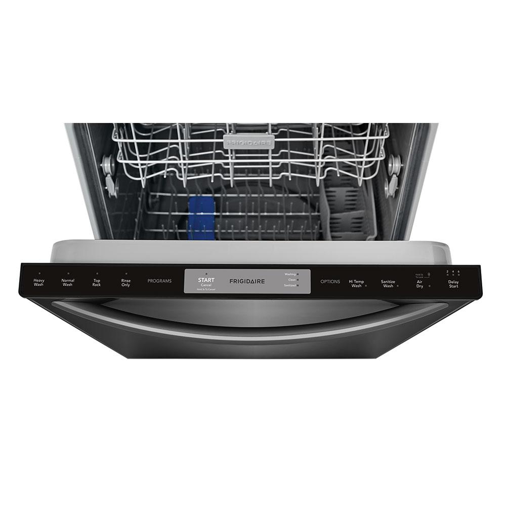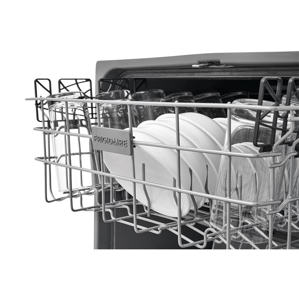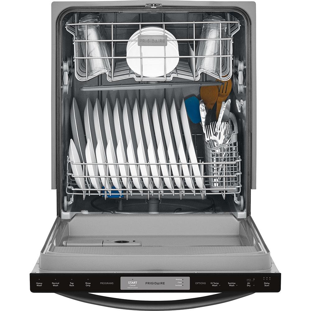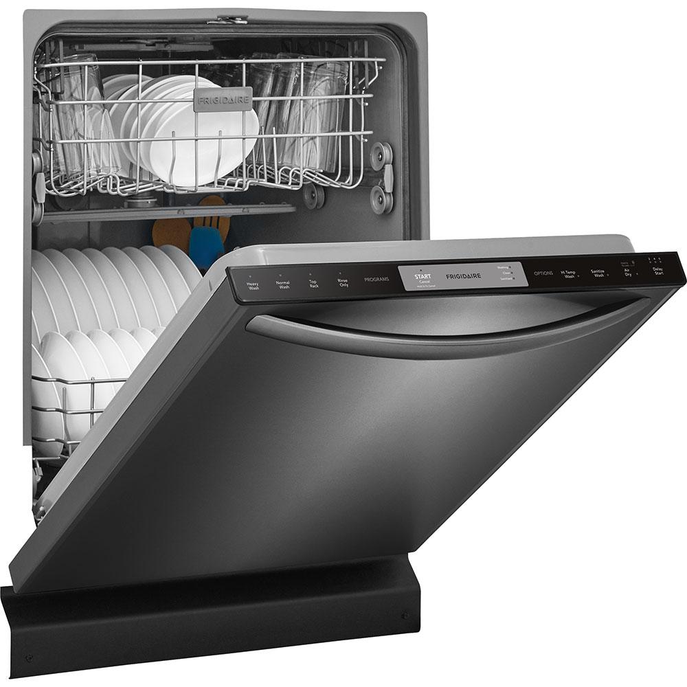 The sleek Frigidaire 24 in. built-in black stainless steel dishwasher with integrated controls uses our stainless steel spray arm and dual filtration system to give you a thorough clean every time. The Effortless Dry system ensures that there’s no need to towel dry before putting the dishes away. With its large capacity and ability automatically adjust the cycle time based on how much cleaning your dishes need, this dishwasher will deliver clean dishes with every load.