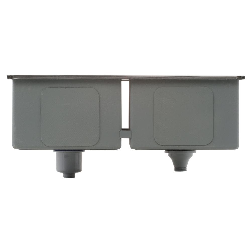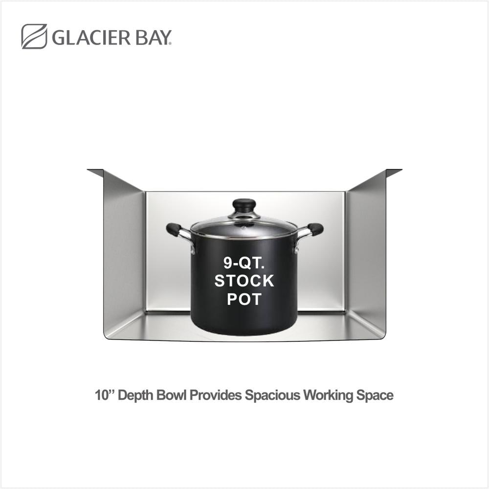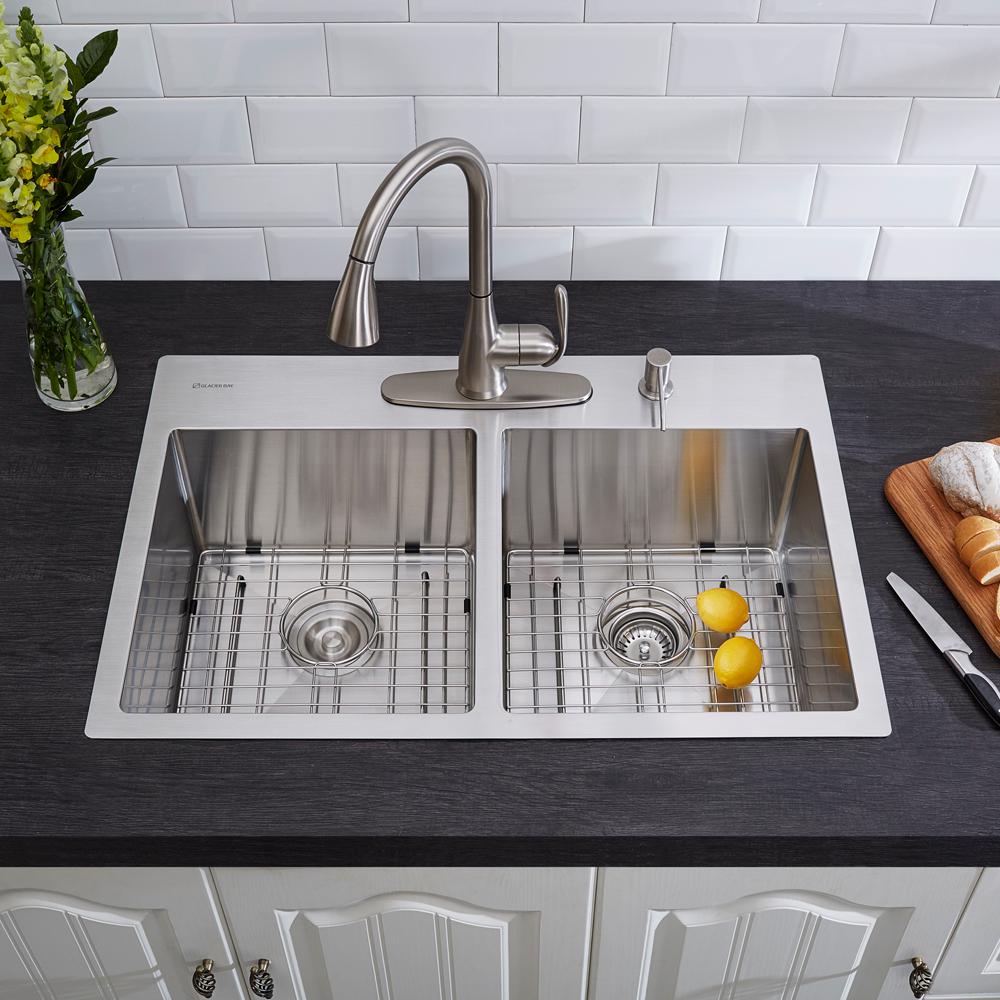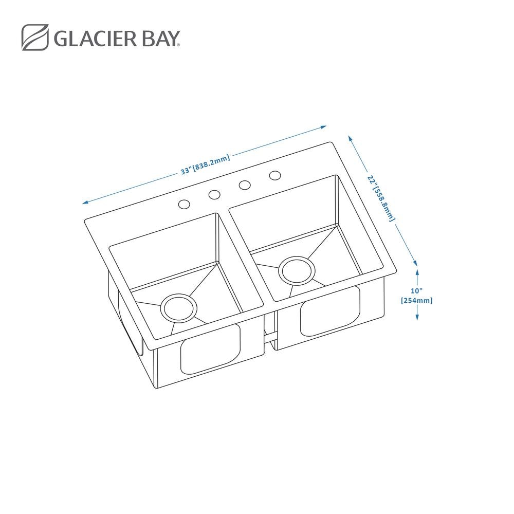 This Glacier Bay Top Mount 33 in. kitchen sink is perfect for washing, rinsing, food prep, and soaking. The 2 deep, spacious bowls allow you to do 2 things with your sink at the same time. Handcrafted from high quality, virgin 304 18-8, heavy gauge stainless steel and sound insulated with noise absorbing pads, plus under spray, this sink is built to last.